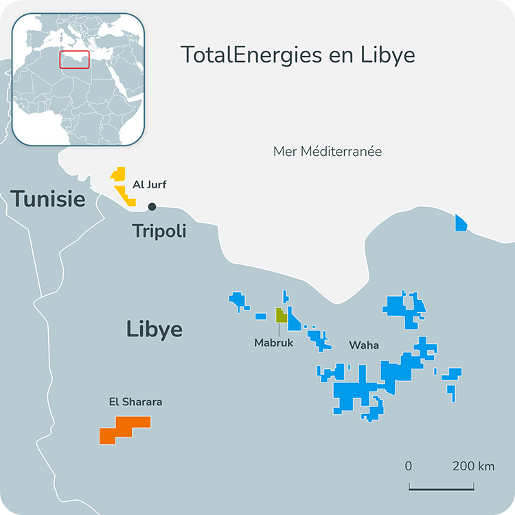 TotalEnergies est présente en Libye depuis 1956. En 2025, la production de la Compagnie dans le pays s’est élevée en moyenne à 113 000 barils équivalent pétrole par jour, issue du champ offshore d’Al Jurf (TotalEnergies : 37,5 %), des zones onshore d’El Sharara (TotalEnergies : 15 % du bloc ex-NC 115 et 12 % du bloc ex-NC 186), de Mabruk (37,5 %) et des concessions onshore de Wah (TotalEnergies : 20,42 %). Les concessions de Waha sont détenues par la NOC (59,16 %), TotalEnergies (20,42 %) et ConocoPhillips (20,42 %) et sont opérées par Waha Oil Company (WOC), une entreprise détenue à 100 % par la NOC.