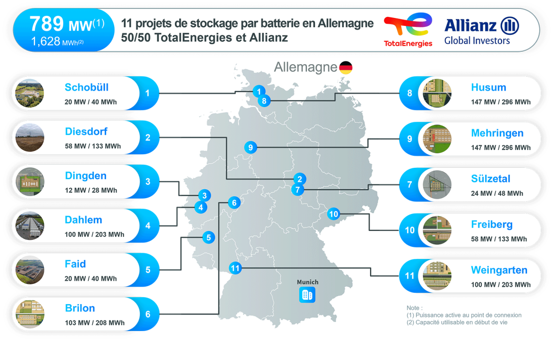 Ces 11 projets répartis sur l’ensemble du territoire allemand ont été développés par Kyon Energy, filiale de TotalEnergies et seront tous opérationnels d’ici 2028. La majorité d’entre eux utiliseront des batteries de dernière génération fournies par Saft, filiale de TotalEnergies et leader mondial dans les batteries haute technologie. TotalEnergies restera opérateur des actifs.
