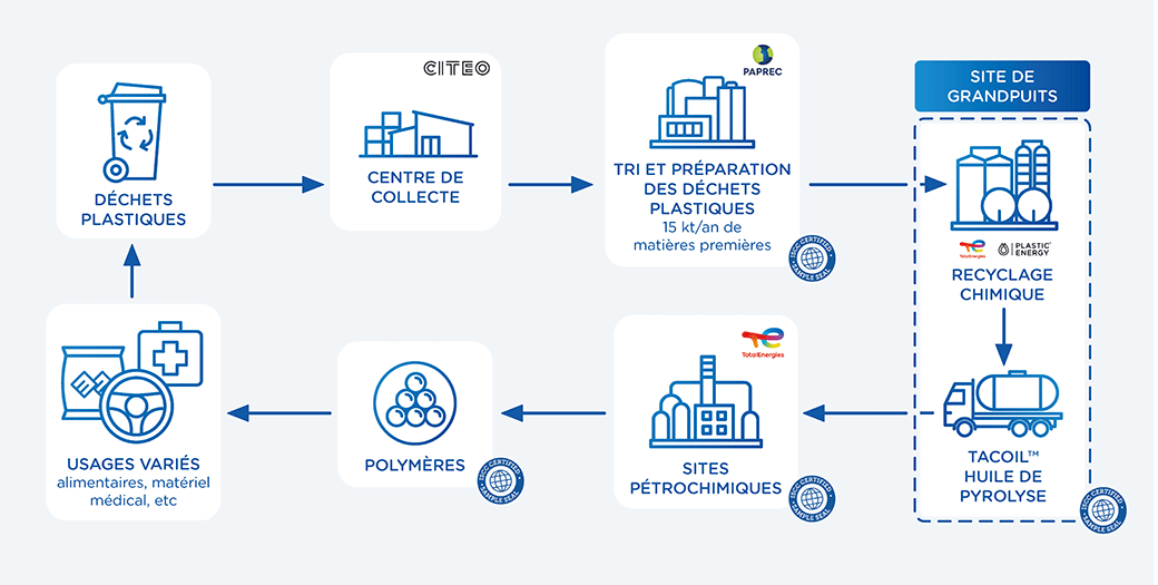 Cette nouvelle usine utilise une technologie innovante de recyclage apportée par notre partenaire Plastic Energy. Elle transforme des déchets plastiques français issus de « la poubelle jaune », difficiles à recycler et actuellement enfouis ou incinérés, en une huile synthétique, par un procédé de pyrolyse, qui consiste à chauffer les déchets à haute température sans oxygène et sous pression. Ce procédé de recyclage chimique permet de traiter des déchets non recyclables mécaniquement.