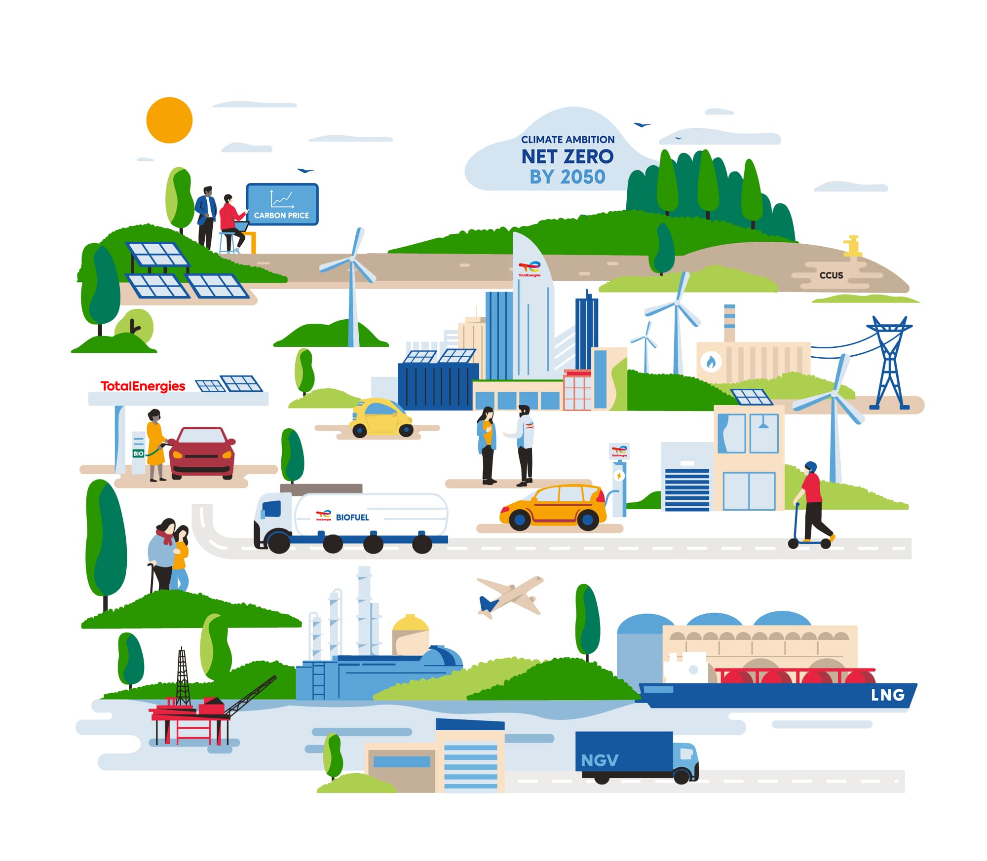 TotalEnergies partage l’ambition d’atteindre la neutralité carbone d’ici à 2050, conjointement avec la société, pour l’ensemble de ses activités, depuis sa production jusqu’à l’utilisation des produits énergétiques vendus à ses clients (scope 1+2+3).